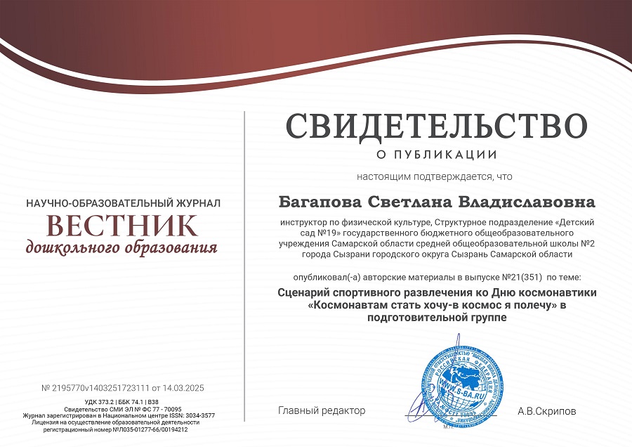 Публикация 2025 Опубликован 10.02.2026 - Размер: 900 × 636 в Участие в профессиональных конкурсах. Наградные документы. Багапова С.В. ← Назад далее →
